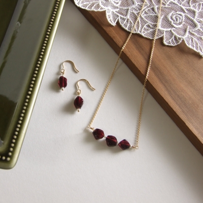 まるでワインのような深い色合いのガーネットに、かわいい小さな淡水パールを合わせ、K14GFを使ったネックレスとピアスです。