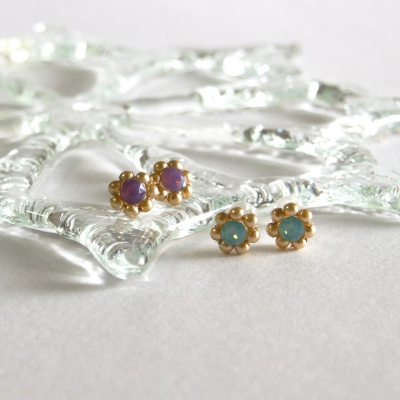 オパールがかった色合いのスワロフスキーを、上品なゴールドカラーのチェコパールで取り巻いた、樹脂ピアスになります。